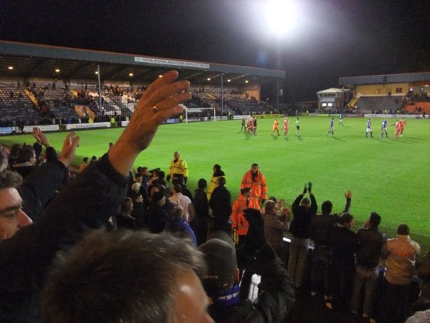 The away fans celebrate the 3-2 victory