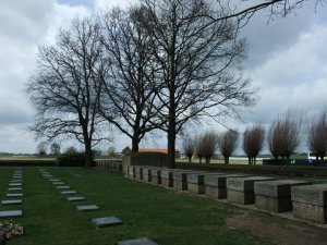 The burials on the site of this British military cemetery were begun by the French Army during the First Battle of Ypres (19th October – 22nd November 1914). The French Army was occupying this sector of the Allied Front Line north of Ypres (Ieper) until mid April 1915. The French war dead who were buried here were removed after the First World War and reburied in a French military cemetery. It is likely that they were re-interred in the French cemetery located in the northern part of the Ypres Salient named Saint-Charles-de-Potyze.