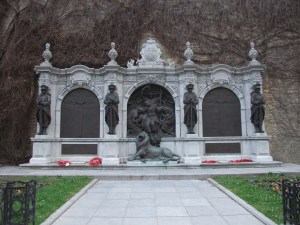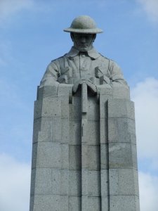 The St. Julien Memorial is a Canadian war memorial and small commemorative park located in Saint Julien, Belgium. The memorial commemorates the Canadian First Division’s participation in the Second Battle of Ypres of World War I and their defence against the first poison gas attacks along the Western Front. Frederick Chapman Clemesha sculpture Brooding Soldier was selected to serve as the monument following a design competition organized by the Canadian Battlefield Monument Commission in 1920.