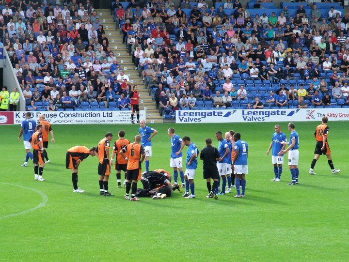 Steve Kabba is down after a tackle from Craig Davies