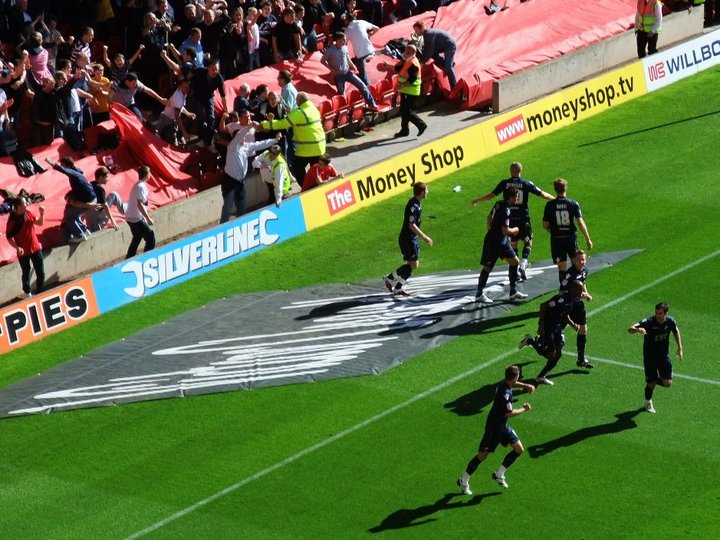 The Millwall players celebrate taking a 1-0 lead after 5 minutes