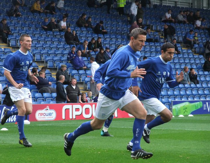 Ian Breckin and Craig Clay warm up before kick off against Crewe