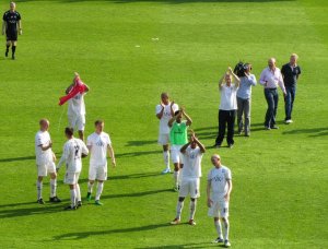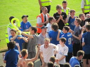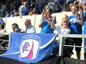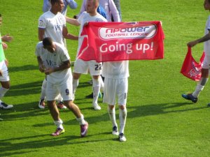 After the match, there were great scenes as all the players came over to the supporters and celebrated with the fans, waving the ‘Going Up’ signs and congratulating each other. A few Chesterfield fans spilled onto the pitch to celebrate with the players, buth both supporters and stewards were good and nothing kicked off. The celebrations lasted for a while after the match before the away supporters gradually began to head home ready for the massive match against Bury on Easter Monday which could be the game that decides who wins the League title.