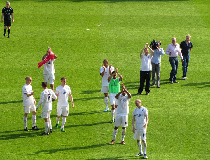 The players and manager John Sheridan come over and applaud the fans