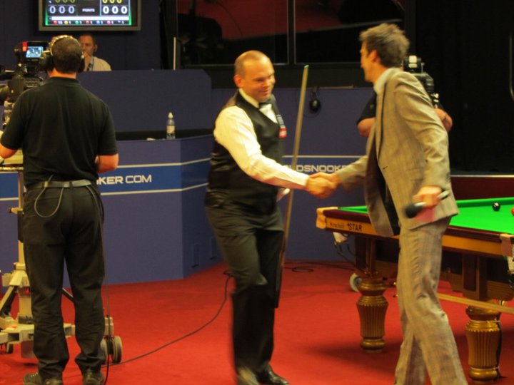 Stuart Bingham is greeted by Rob Walker