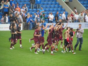 The players celebrate in front of the fans