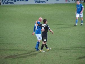 Chesterfield midfielder Danny Whitaker chats to former Oldham team mate Dean Furman