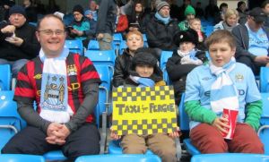 A young City fan holds up a "Taxi for Fergie" sign