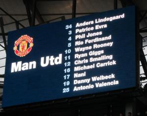 Lindegaard, Evra, Jones, Ferdinand, Smalling, Giggs, Carrick, Nani (Scholes ’59), Valencia, Welbeck (Anderson ’75), Rooney