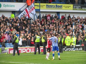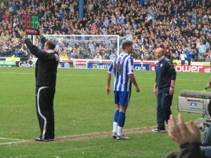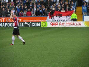 Nick Montgomery applauds the away supporters while some Dutch Owls unveil their flag