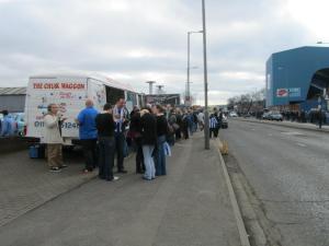 Fans queue at a burger van outside the ground