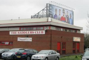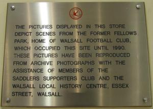 The Saddlers played at Fellows Park, from 1896 until 1990. The ground was originally known as Hilary Street until 1930, when it was renamed after H.L. Fellows, a club director. The site is now a Morrison’s supermarket and the only reminder of the old ground is a plaque inside which we went to have a look at and photograph.