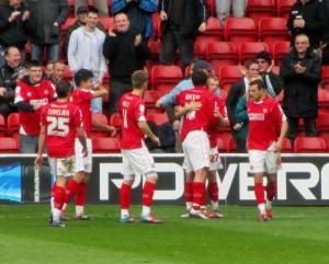 The Walsall players celebrate Ledesma's goal which makes it 2-1