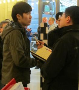 After the afternoon session ended, we had another walk around the Crucible for a short time while the rain held off. During this time I had a picture with Mark Allen, who was very friendly despite having just lost. I also met Cao Yupeng after his victory and another young Chinese qualifier Liu Chuang, who plays Mark Williams later in the week. TV presenter Richard Osman was also in attendance and I had a picture with him as well as MC Lloyd Davies, who was standing in for Rob Walker today and was telling us how he was delighted to be a part of the World Championships this year.