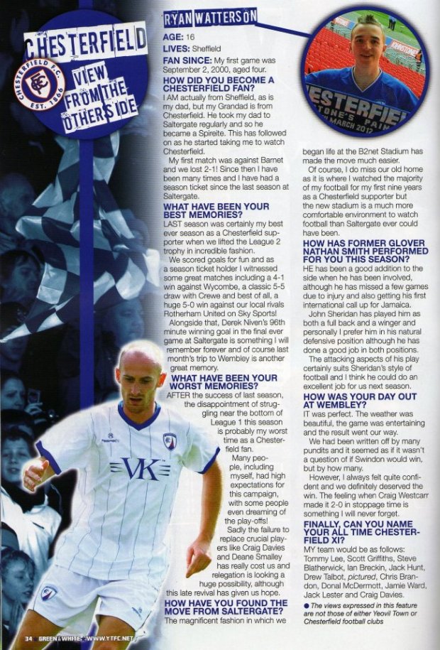 Ahead of the Yeovil Town v Chesterfield match on 28th April, I did an article for the ‘Green and White’ matchday programme for their ‘View from the other side’ section. I talk about my highlights, worst moments, my day out at Wembley and much more.