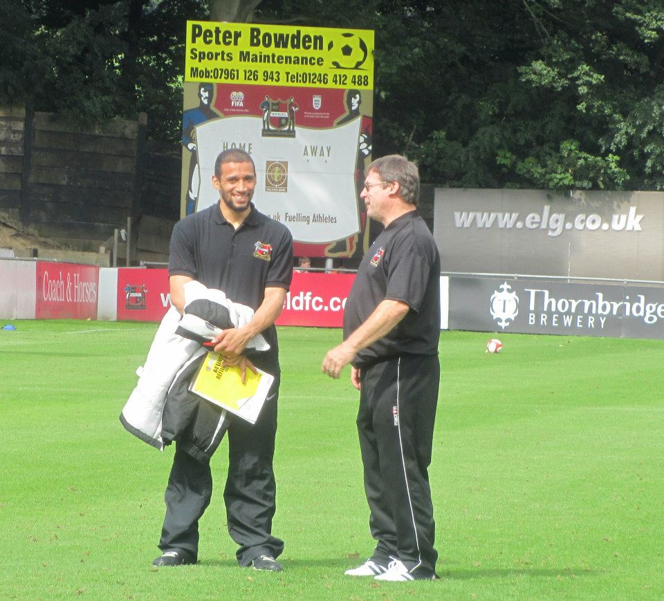 Manager Curtis Woodhouse chats to physio Mick Jenkins during the warm up