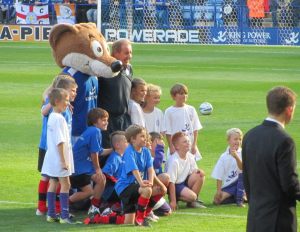 Filbert the Fox and Alan Birchenall pose for a photograph with some young Leicester fans