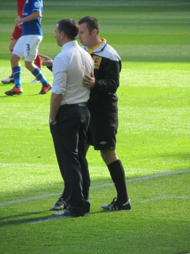 The fourth official has a word with the Robins manager