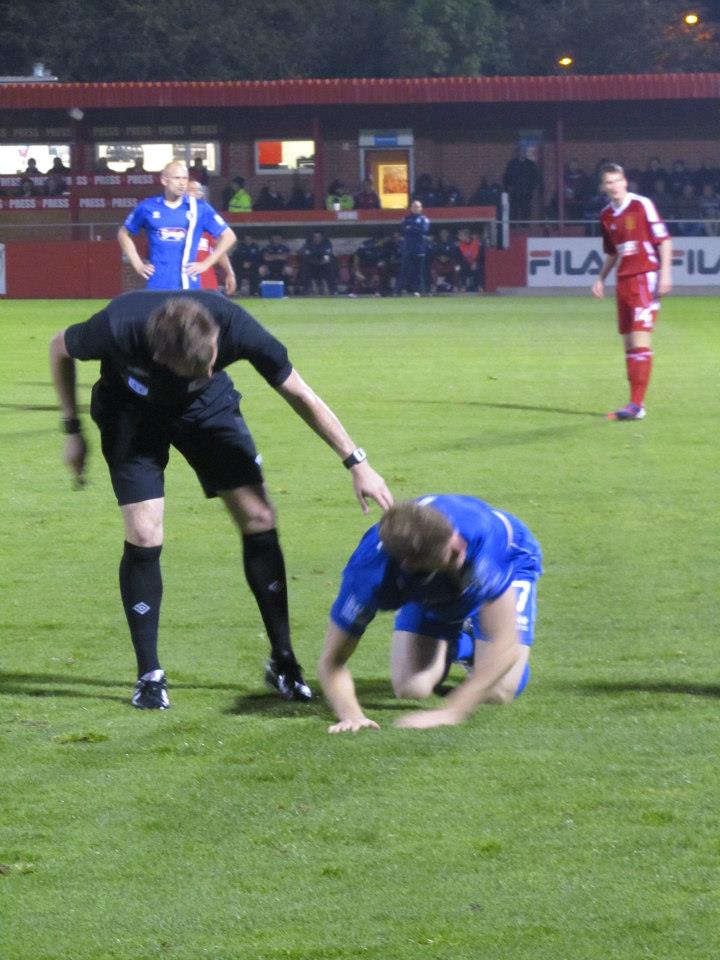 The referee checks on a Grimsby player after he is brought down