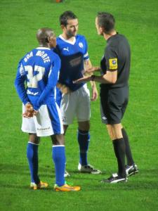 Referee Darren Deadman speaks to Luis Boa Morte and Sam Hird