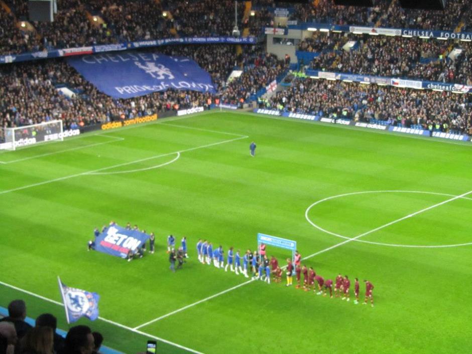 The players line up as the home fans unveil a flag