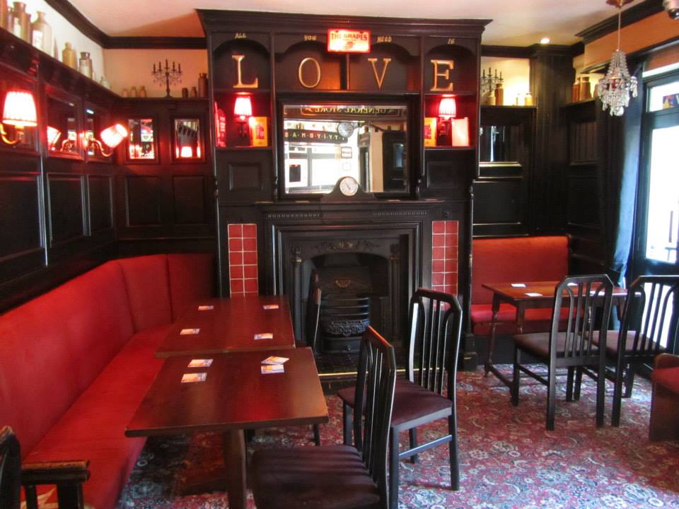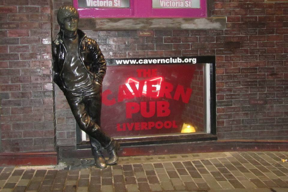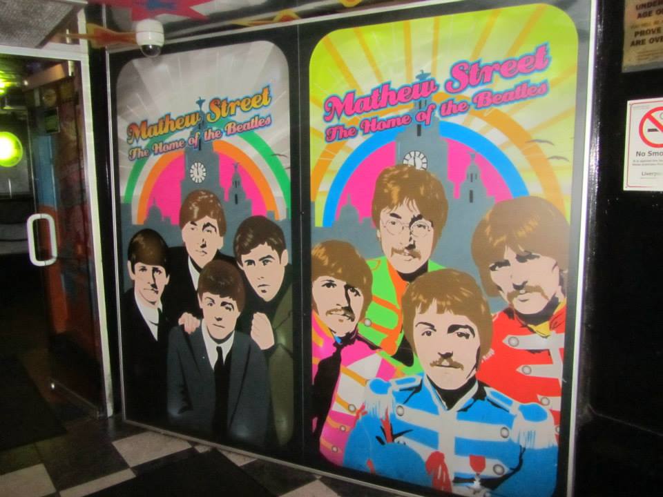 The Grapes pub on Mathew Street, which stood just across the road from the Cavern club, was a favourite Beatle hang out in the early 60’s. The back room today is a ‘shrine’ to the band and includes an actual photograph of the band (with Pete Best) sat in the corner. This dates from around Spring 1961 and even today you can still sit in the same corner as John, Paul, George and Pete! Some of the wallpaper from the photograph is also preserved in the pub. However, the photo that hangs in the pub is shown as a reversed image, Lennon should be sat on the left with McCartney on the right.
