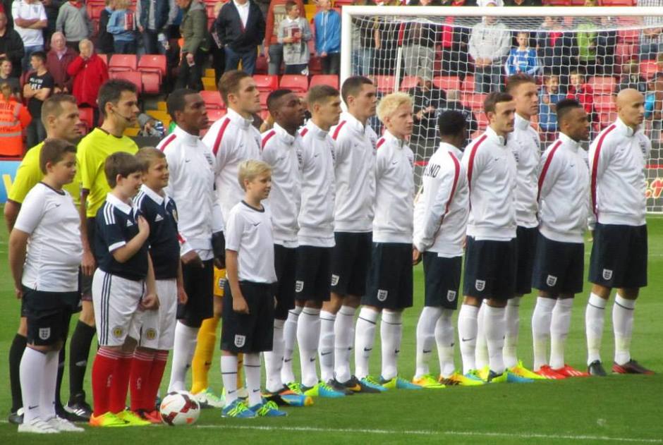 The England players stand for their national anthem