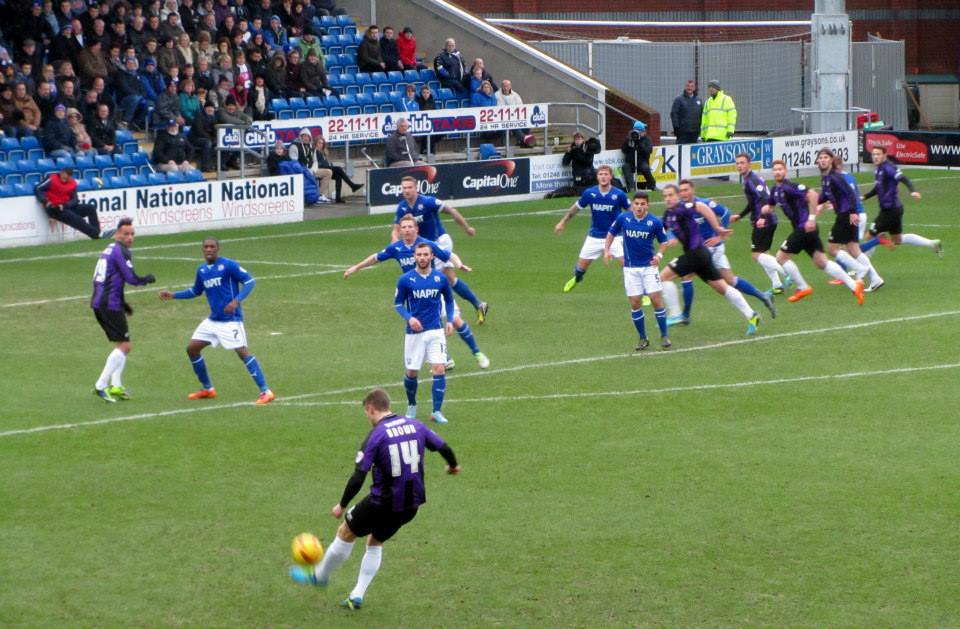The leveller did not appear to dishearten the Spireites however, and just eight minutes later they were back in front. Gary Roberts’ low cross from the wing found Ollie Banks, who calmly side footed the ball in to the bottom corner to restore the home sides’ advantage.