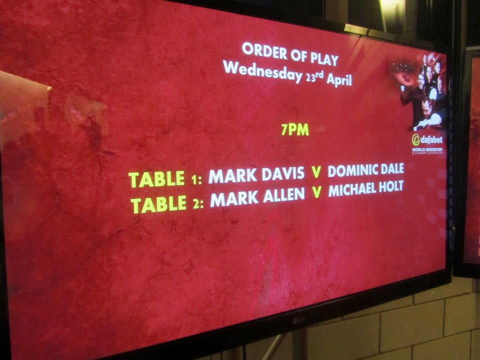 On Wednesday 24th April 2014, I went to the Crucible Theatre to watch Mark Davis play Dominic Dale in the World Snooker Championship.