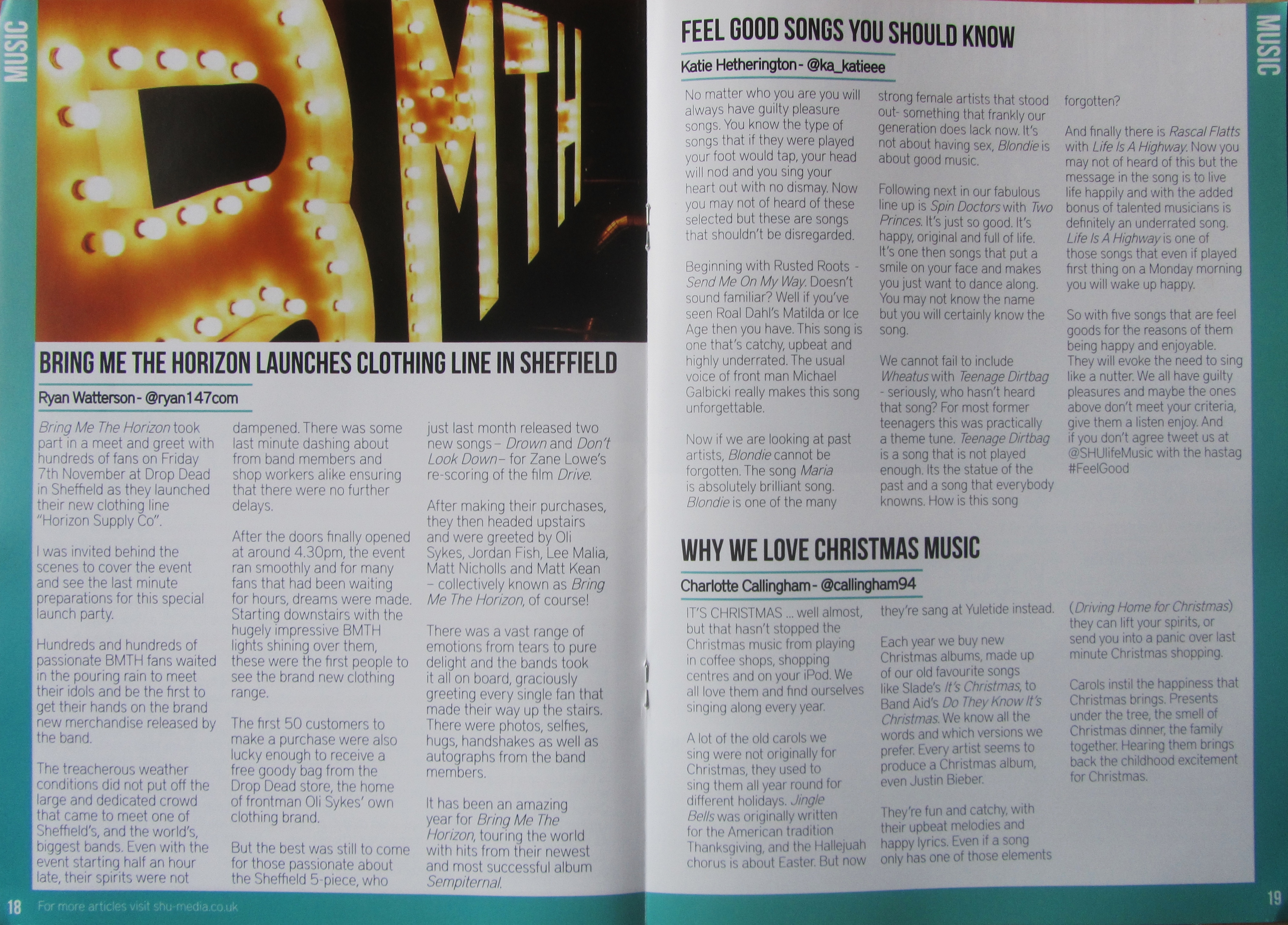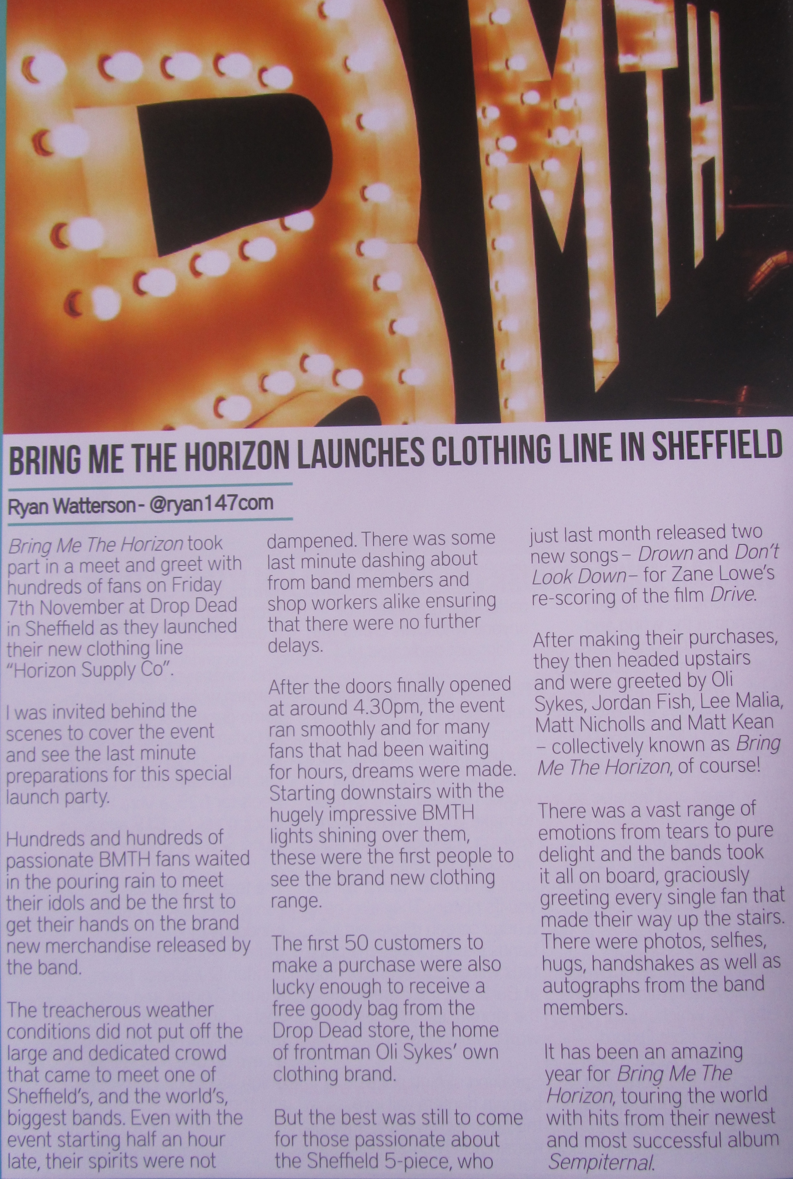 SHULife Magazine – Bring Me The Horizon Article My article about Bring Me The Horizon’s launch of their Horizon Supply Co. clothing line last month has been published in the latest edition of SHULife Magazine – the official magazine of Sheffield Hallam University. Click below to read it! (click for full size) (click for full size) Share this: Click to share on X (Opens in new window) X Click to share on Facebook (Opens in new window) Facebook Click to share on Reddit (Opens in new window) Reddit Like Loading... Related