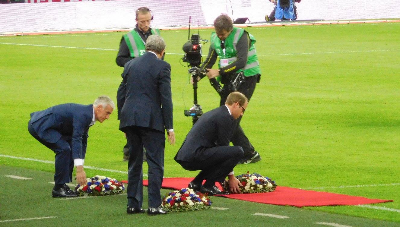 EngFra33 ← Previous Next → Prince William, France manager Didier Deschamps and England manager Roy Hodgson place flowers at pitchside